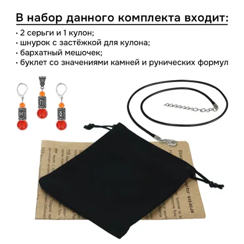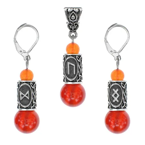 Рунический комплект Физическая энергия включает серьги и кулон из натурального сердолика с бусинами диаметром 6 и 10 мм.
