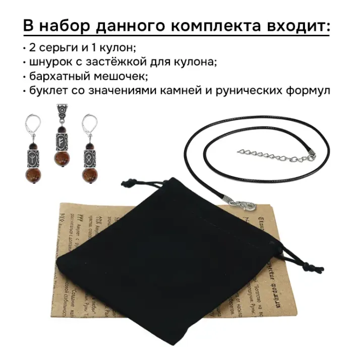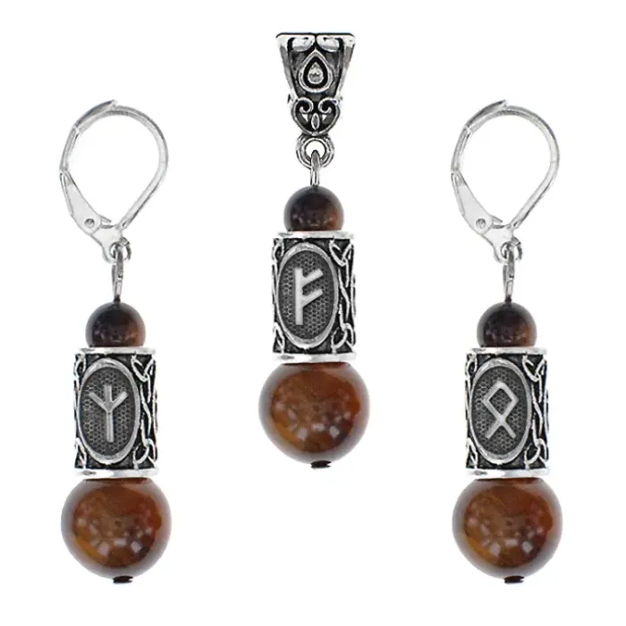 Сувенирный рунический комплект, включающий серьги и кулон. Изготовлен из натурального камня тигровый глаз и бижутерного сплава.
