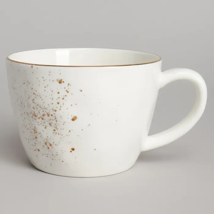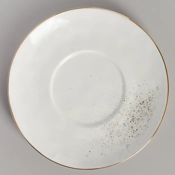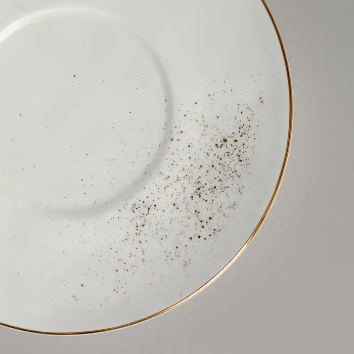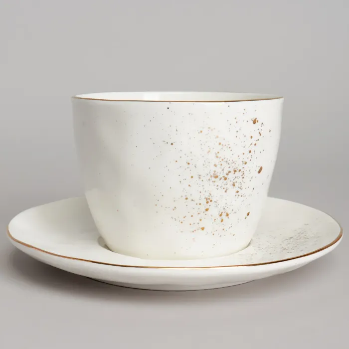 Пара изготовлена из прочного фарфора, подходящего для повседневного использования. Дизайн включает тонкую золотую окантовку по краю и мелкие золотые брызги, нанесённые на поверхность. Форма чашки и блюдца имеет лаконичные, смелые линии.