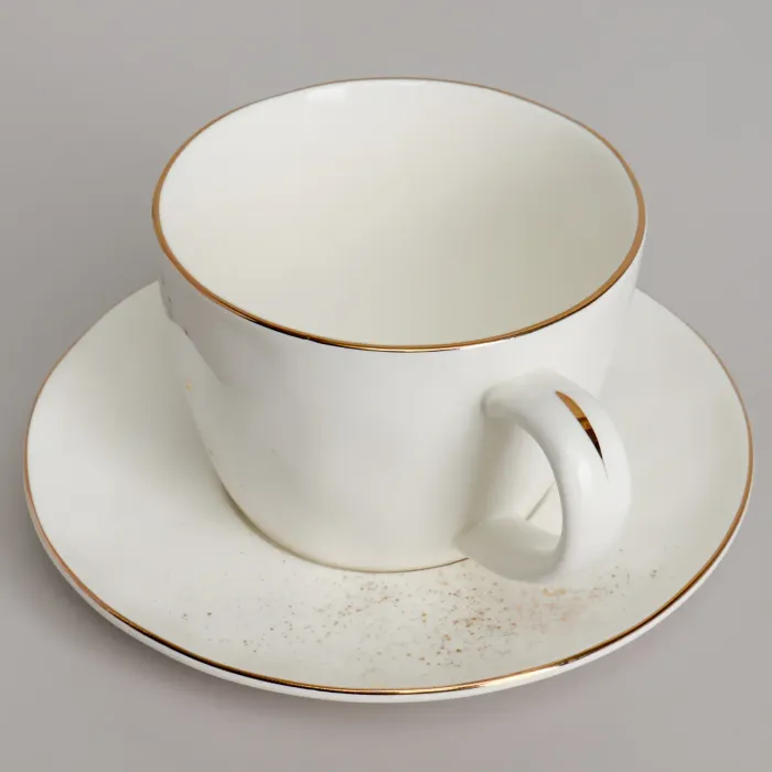 - Материал: фарфор- Объём чашки: 350 мл- Количество предметов в наборе: чашка и блюдце- Особенности: декор золотой окантовкой и брызгами