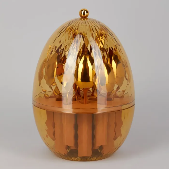 Приборы выполнены из нержавеющей стали марки 18/10, содержащей 18% хрома и 10% никеля для повышения прочности и гигиеничности. Поливинилденхлоридное (ПВД) покрытие наносится для дополнительной защиты поверхности. Вращающаяся подставка в форме яйца служит для компактного хранения и лёгкого доступа ко всем предметам набора.