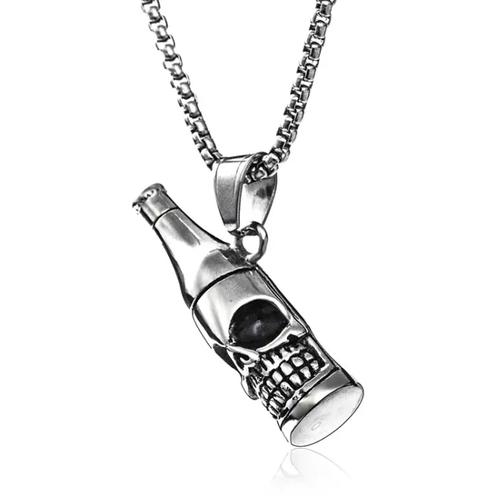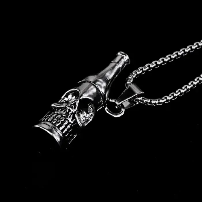 Сувенирный амулет в виде бутылки с черепом на цепочке. Изготовлен из нержавеющей стали.