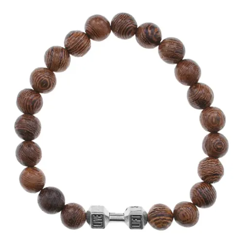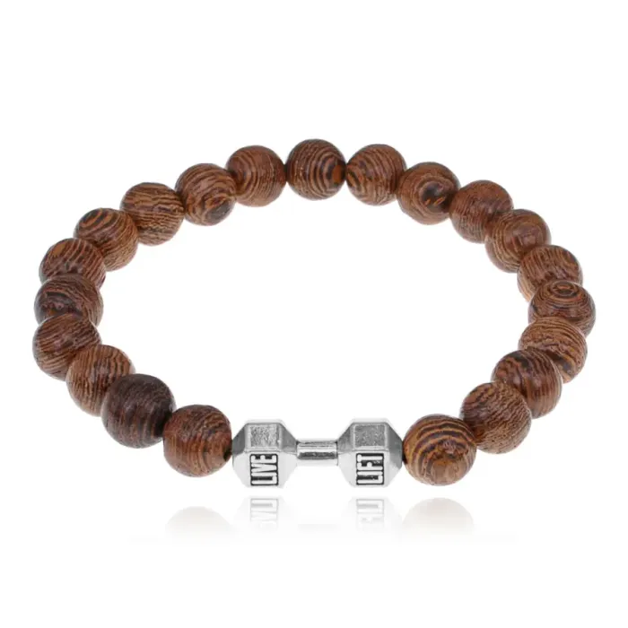 Деревянный браслет с металлическими элементами в виде гантелей.