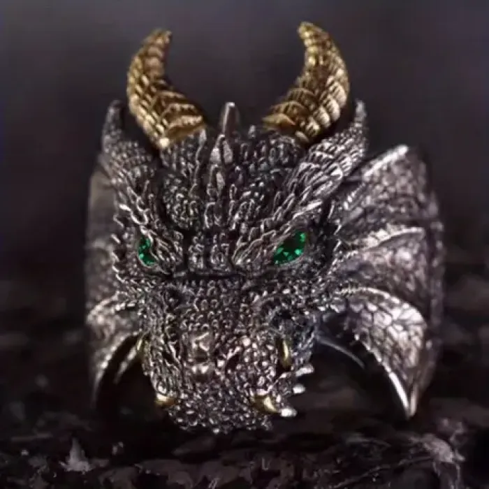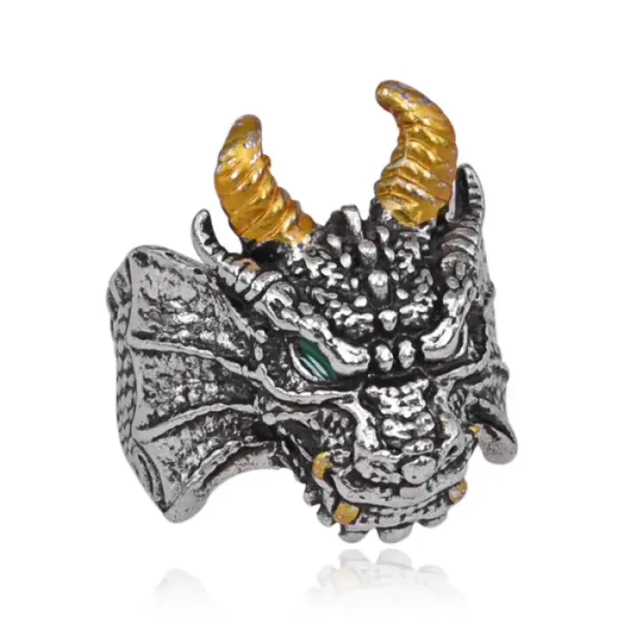 Безразмерное кольцо с изображением дракона из металла с покрытием под золото и серебро.