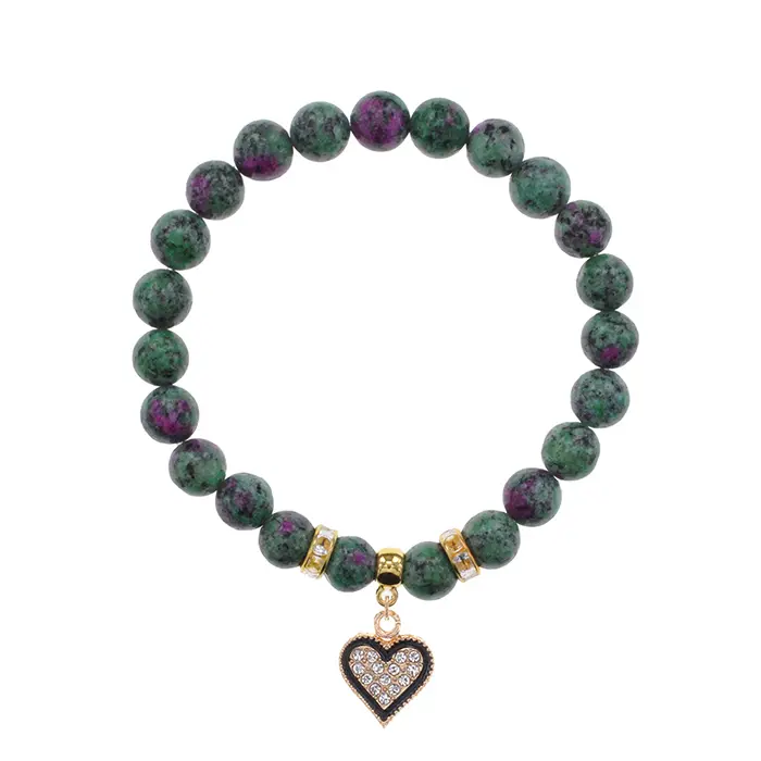 Стрейч-браслет из синтетического камня цоизит с подвеской в виде сердца и фурнитурой под золото.