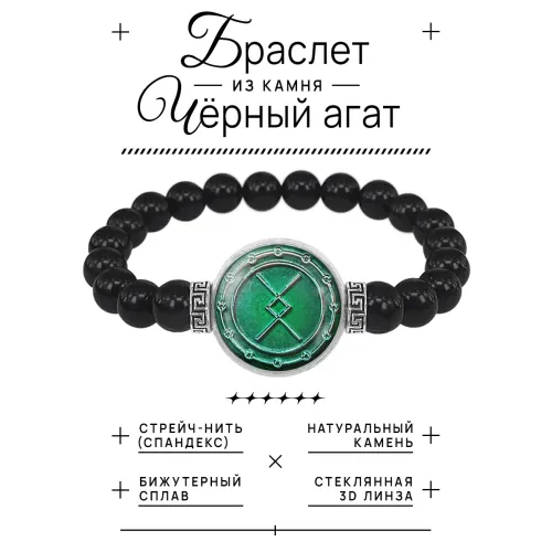 Материал и изготовление: Бусины из черного агата диаметром 8 мм. Изображение руны расположено под выпуклой стеклянной линзой диаметром 20 мм. Фурнитура из бижутерного сплава с покрытием под серебро.