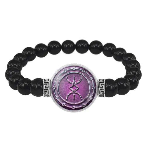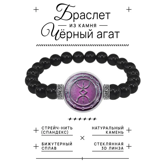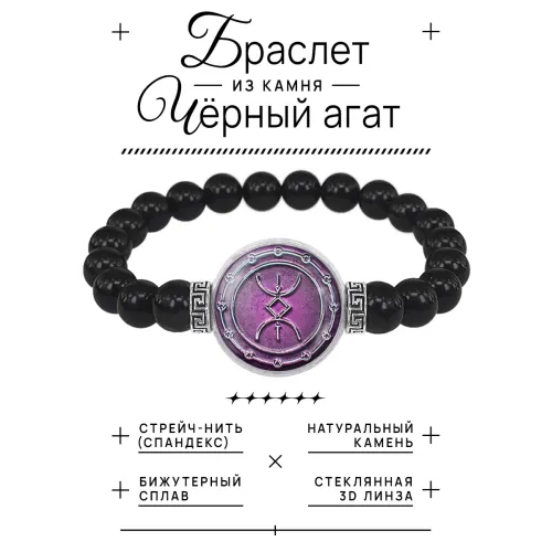 Стрейч-браслет из чёрного агата с изображением руны под выпуклой стеклянной линзой.