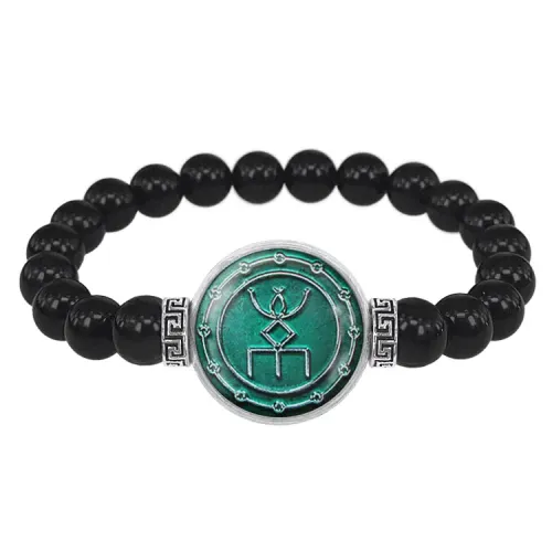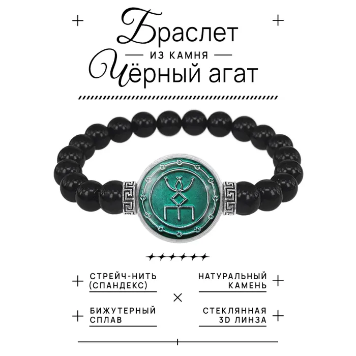 Стрейч-браслет-амулет с изображением руны. Изготовлен из бусин чёрного агата и бижутерного сплава, украшен выпуклой стеклянной линзой.