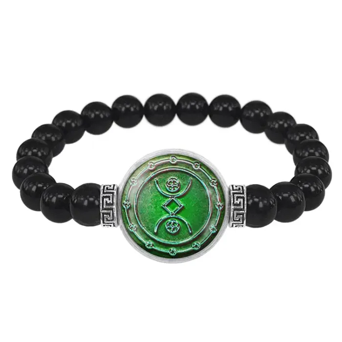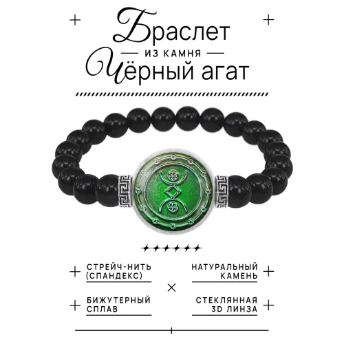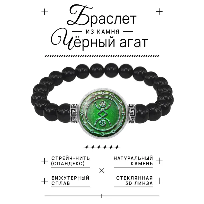 Стрейч-браслет-амулет с изображением руны выполнен из бусин чёрного агата и декоративного элемента под стеклянной линзой.