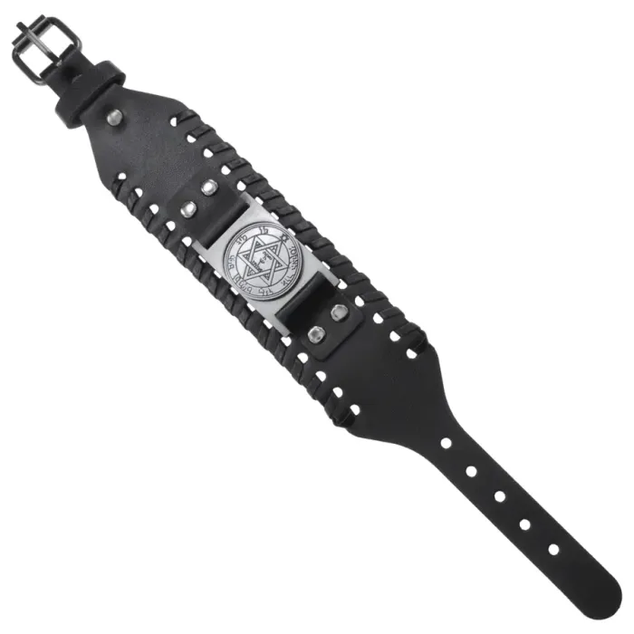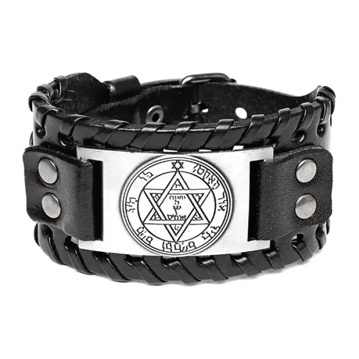 Кожаный браслет с металлическим декоративным элементом в виде пентакля.