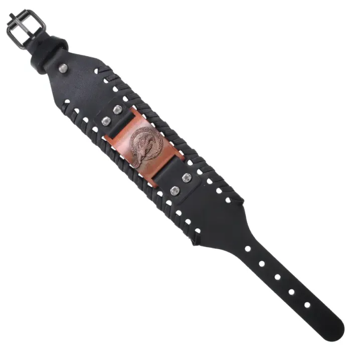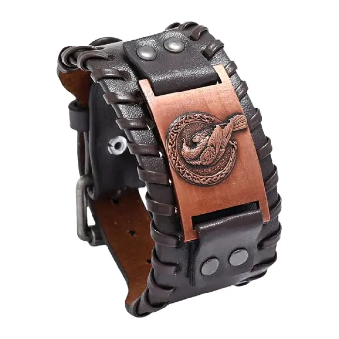 Кожаный браслет с декоративным элементом в виде ворона. Материал — натуральная кожа и металл.
