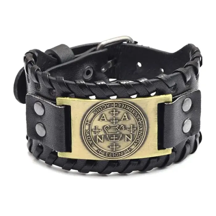 Кожаный браслет с металлическим декоративным элементом в виде пентакля.