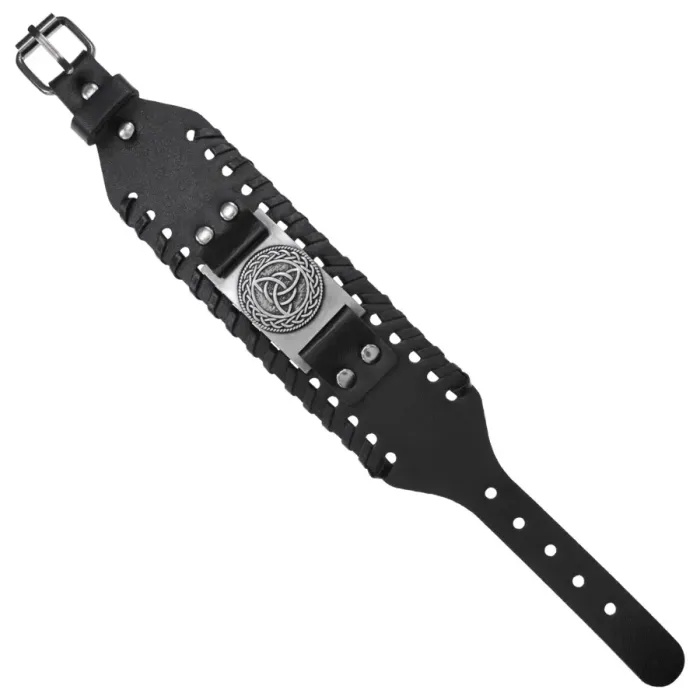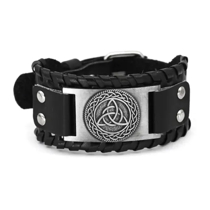 Кожаный браслет с металлическим декоративным элементом в виде трикветра. Цвет черный.