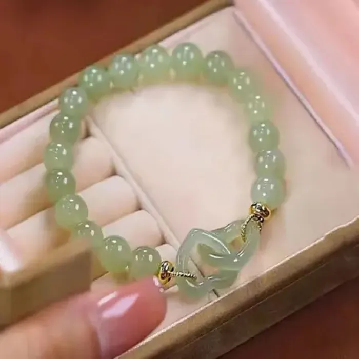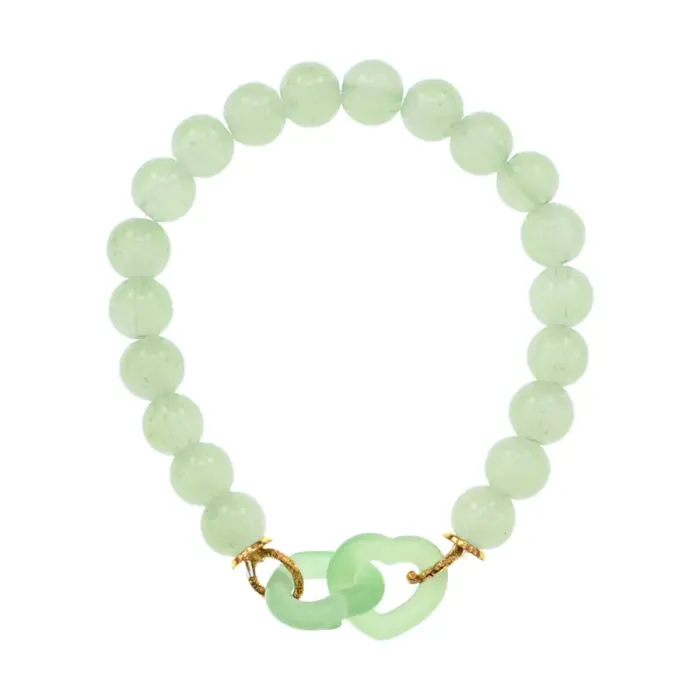 Стрейч-браслет с коннектором в виде двух сердец из бусин синтетического нефрита и металла.