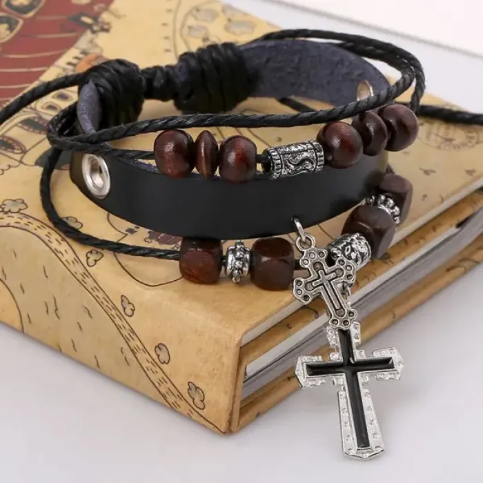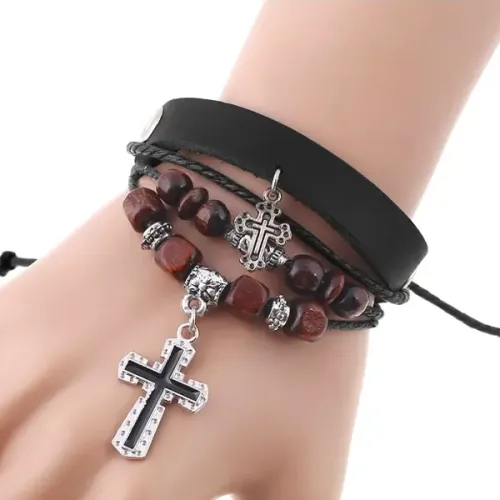 Кожаный браслет с декоративным элементом в виде креста. Изготовлен из текстиля, натуральной кожи и металла.