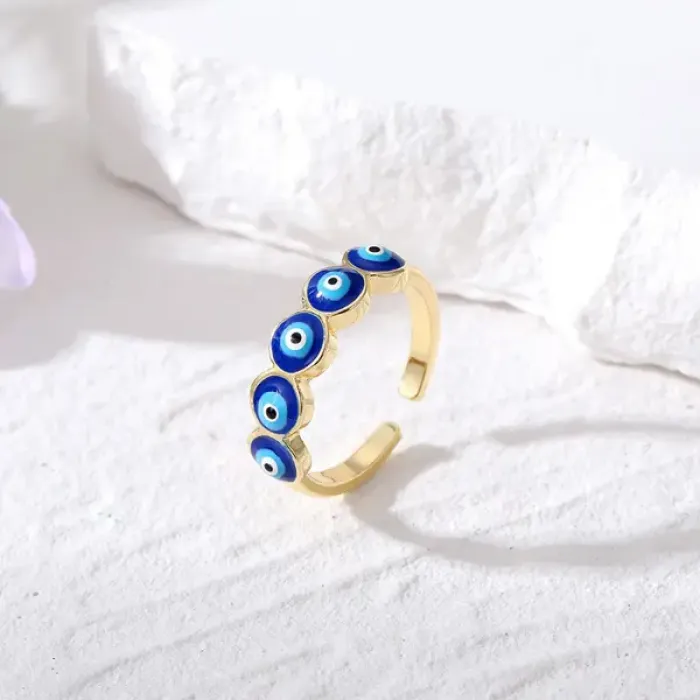 Безразмерное кольцо от сглаза из бижутерного сплава с покрытием под золото и эмалью.