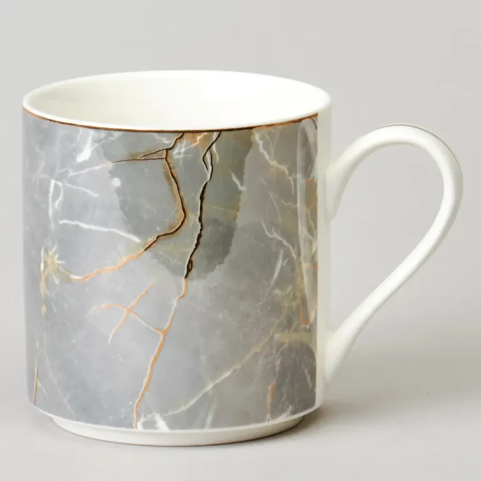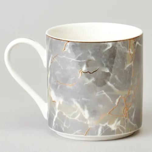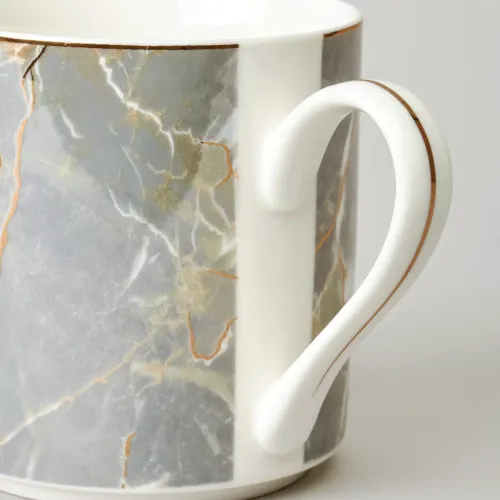 Кружка выполнена из упрочнённого фарфора, что обеспечивает её прочность и долговечность. Поверхность изделия декорирована рисунком, имитирующим мрамор, с нанесением золотых линий. Ручка кружки является частью общей конструкции, обеспечивая удобный захват.