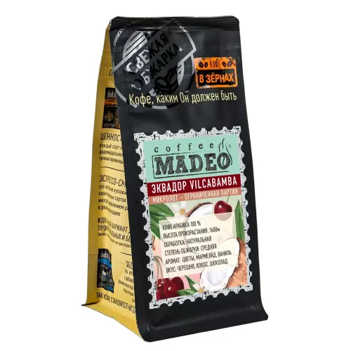 Плантационный кофе Madeo из долины Вилкабамба в Эквадоре. Средняя обжарка раскрывает насыщенный аромат с цветочными нотами, сладким мармеладом и ванилью. Вкус отличается яркими оттенками черешни, сливочным шоколадным послевкусием и экзотическими нотками кокоса.