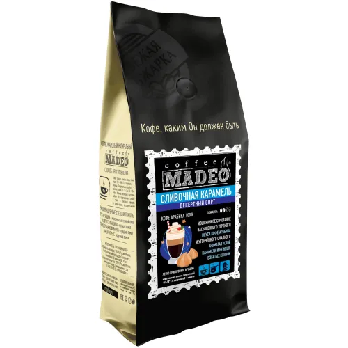 Десертный кофе Madeo «Сливочная карамель» — это натуральная арабика (обработка Natural) из стран Латинской Америки, обжаренная до средней степени. Вкусовой профиль построен на нотах сладкой карамели и ириски с мягкими сливочными и ванильными оттенками, создавая впечатление десерта в чашке.