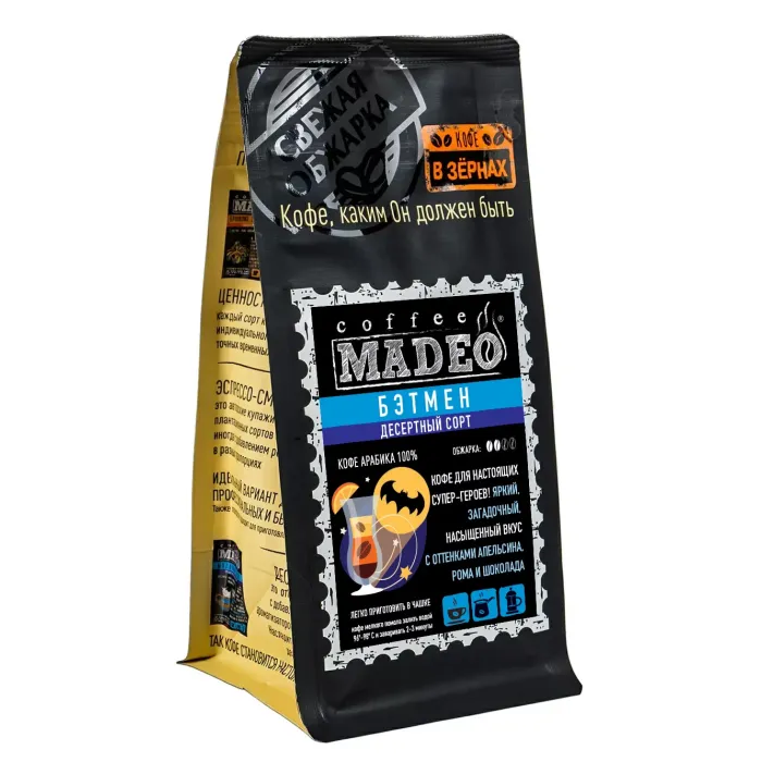 Десертный молотый кофе Madeo «Бэтмен» создан из арабики, выращенной в странах Латинской Америки. Средняя обжарка раскрывает насыщенный вкус с нотами апельсина, рома и шоколада, а также аромат с экзотическими оттенками.