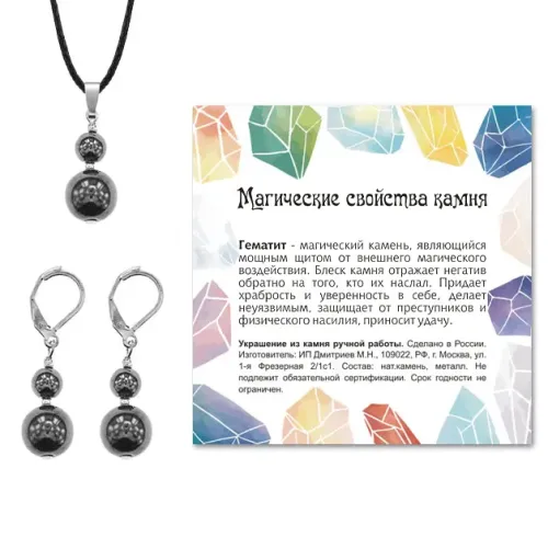 Комплект бижутерии, состоящий из серёг и кулона, выполнен из синтетического гематита и бижутерного сплава.