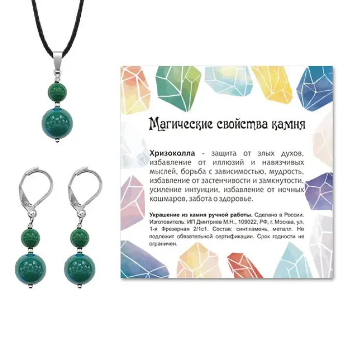 Размеры и комплектация: Серьги длиной 38 мм, кулон длиной 30 мм. Бусины диаметром 6 мм и 10 мм. Упаковка: прозрачный пакет с подвесом, включает вкладыш с описанием камня.