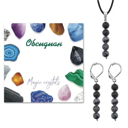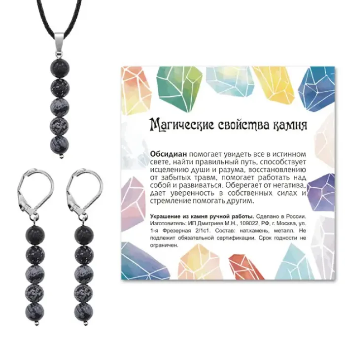 Комплект украшений: серьги и кулон ручной работы из натурального снежного обсидиана.