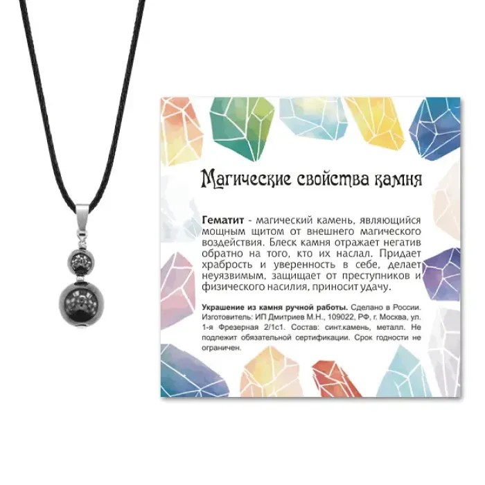 Размеры и комплектация: Длина кулона 30 мм, диаметр бусин 6 мм и 10 мм. Упаковка: прозрачный пакет с подвесом, в комплекте шнурок и вкладыш с описанием.