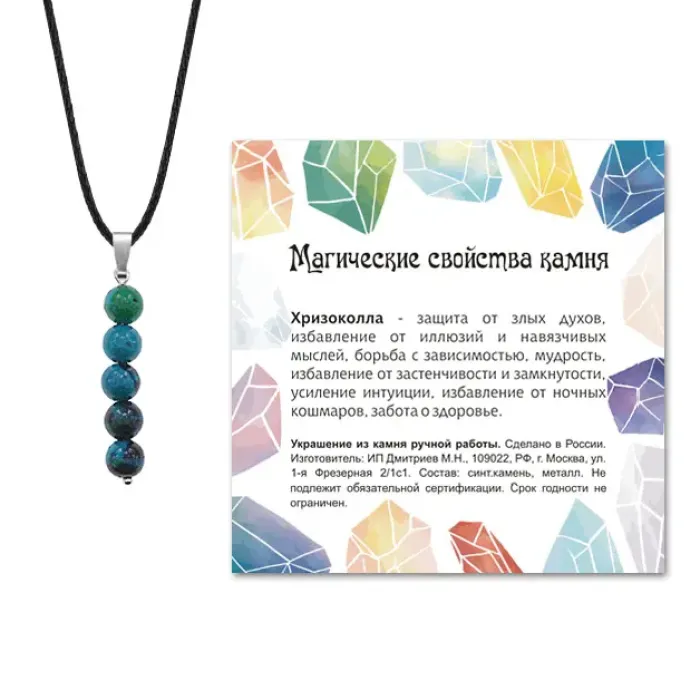 Размеры и комплектация: Длина кулона 40 мм, диаметр бусин 6 мм. В комплекте шнурок, упаковка — прозрачный пакет с подвесом и вкладышем.
