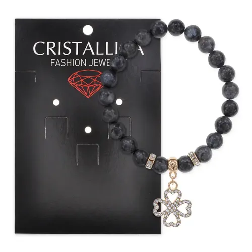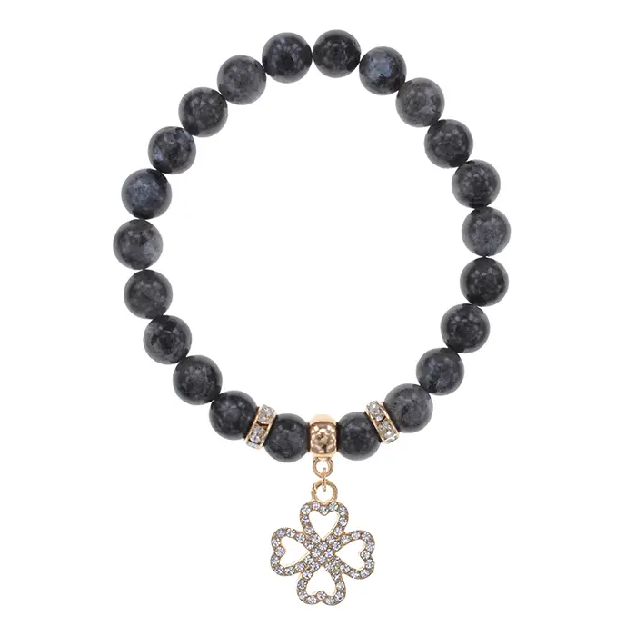 Стрейч-браслет из натурального камня лабрадор с бусинами в виде клевера и фурнитурой светлого золота.