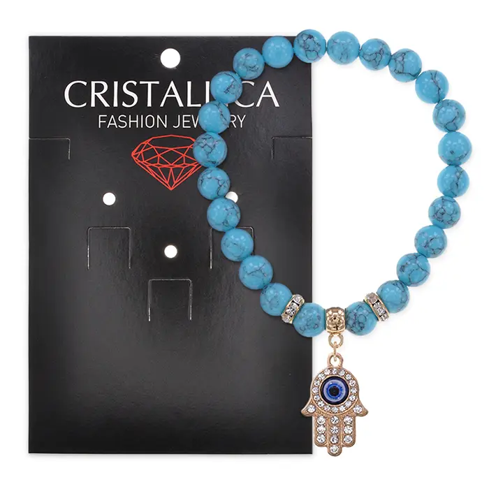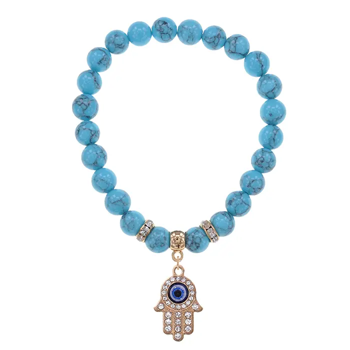 Стрейч-браслет с символом Хамса, украшенный бусинами из синтетического камня под бирюзу и стразами.