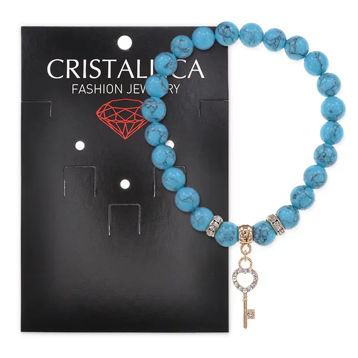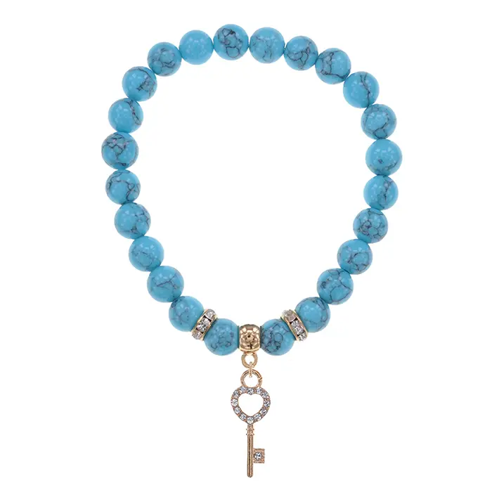Стрейч-браслет из коллекции Cristallica с бусинами из синтетического камня под бирюзу диаметром 8 мм и декоративным элементом в виде ключа.