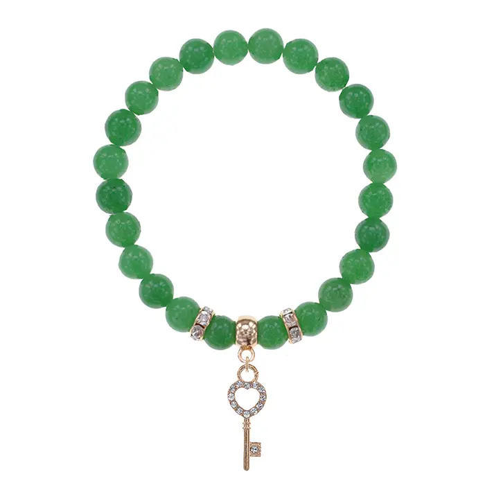 Браслет из натурального нефрита с бусинами диаметром 8 мм и золотой фурнитурой. Дизайн включает подвеску в виде ключа и стразы.