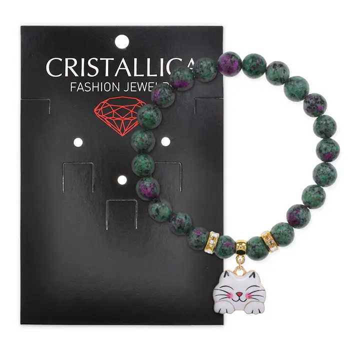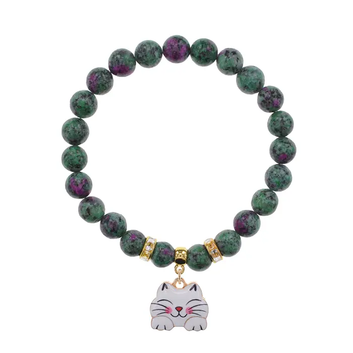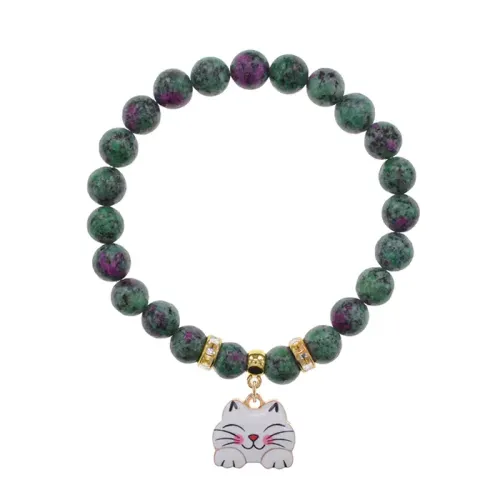 Браслет из синтетического камня цоизит с декоративным элементом в виде кошки.