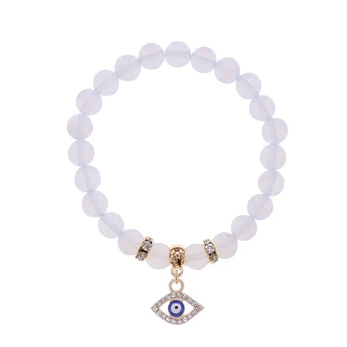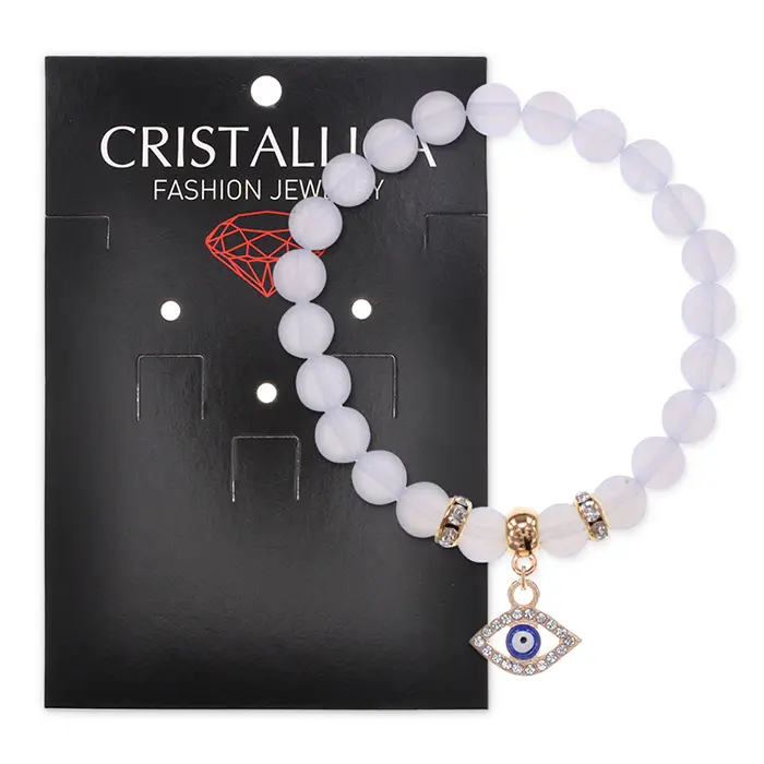 Стрейч-браслет из синтетического лунного камня (опалита) с символикой глаза и стразами.