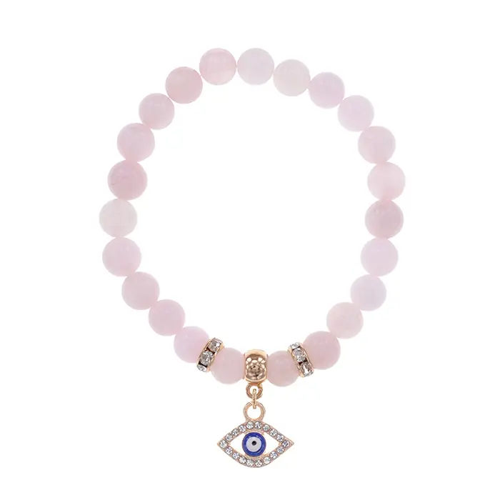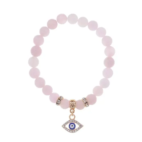 Браслет из натурального розового кварца с бусинами в виде глаза и фурнитурой светлого золота.
