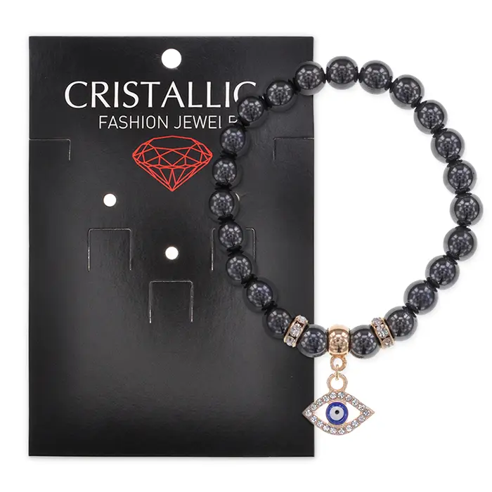 Стрейч-браслет для защиты от сглаза из синтетического гематита, украшенный стразами и фурнитурой под золото.