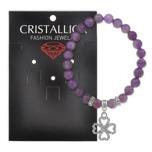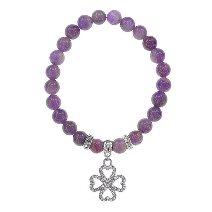 Стрейч-браслет из натурального аметиста с подвеской в виде клевера и стразами.