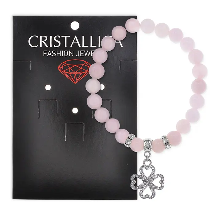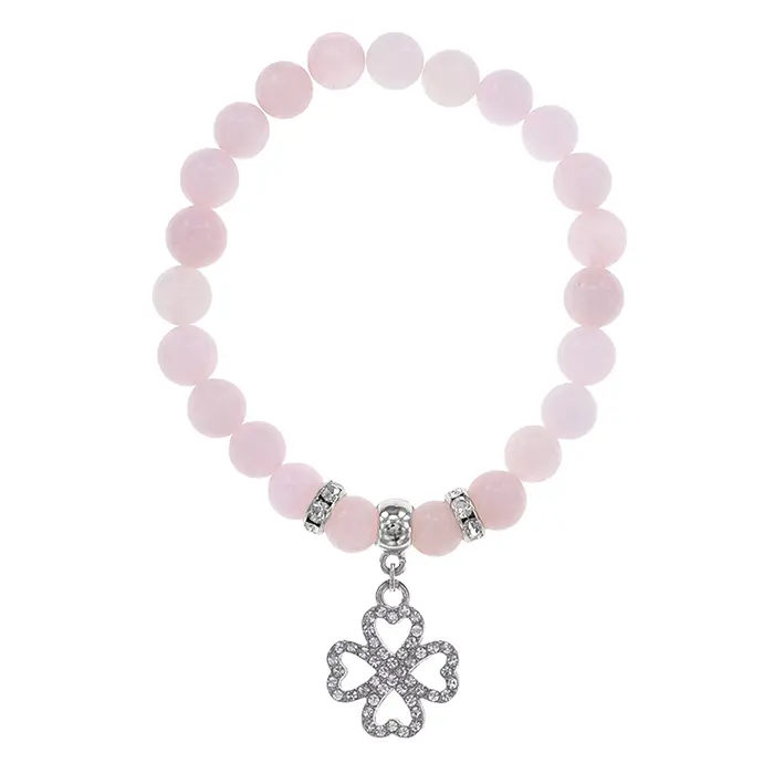 Стрейч-браслет из натурального розового кварца с подвеской в виде клевера и стразами.