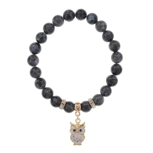 Браслет из натурального камня лабрадор с подвеской в виде совы. Цвет фурнитуры — светлое золото.