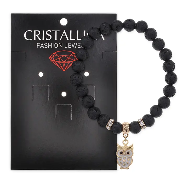 Браслет из натурального камня лава с подвеской в виде совы и стразами.