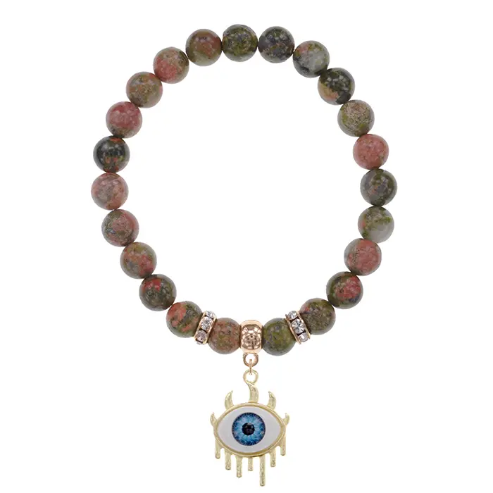 Стрейч-браслет из натурального камня унакит с символикой глаза, традиционно используемый как защитный амулет.