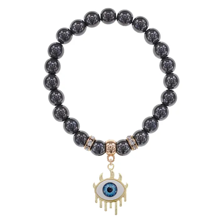 Стрейч-браслет с элементами из синтетического камня гематит. Дизайн включает подвеску в виде глаза.