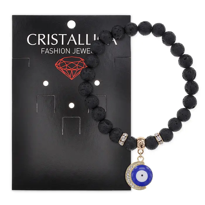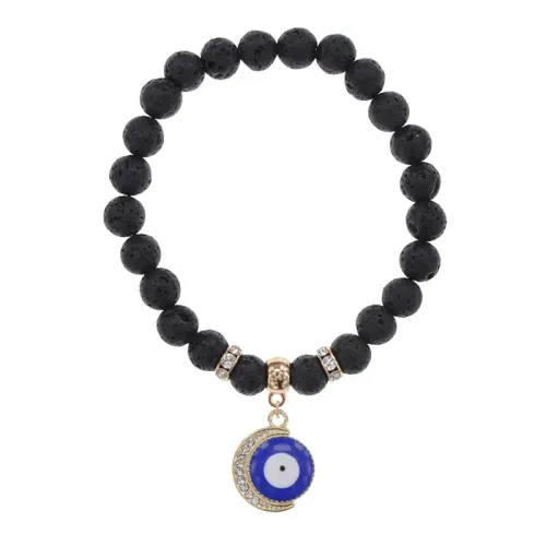Стрейч-браслет из натурального камня лава с подвесками в виде полумесяца и глаза.
