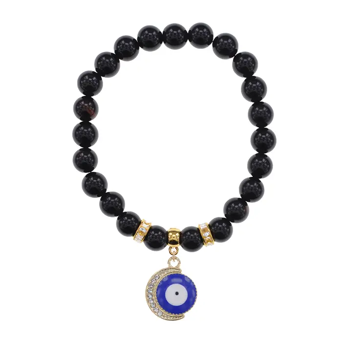 Стрейч-браслет из натурального черного агата с подвесками в виде полумесяца и глаза.