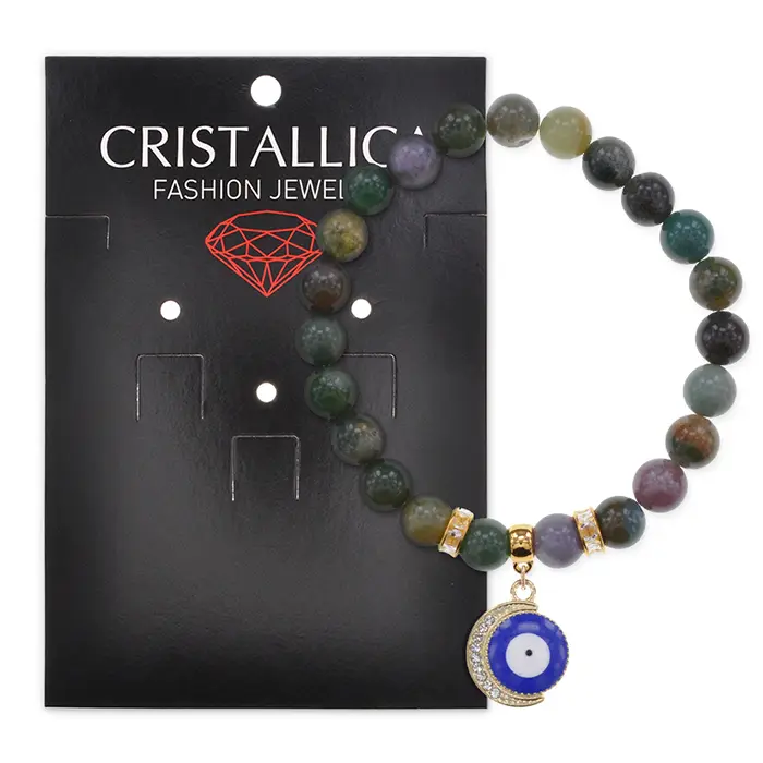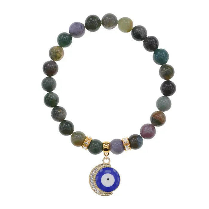 Стрейч-браслет из натуральной яшмы с подвеской в виде полумесяца и глаза, украшенный стразами.