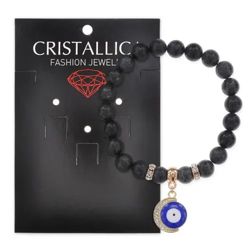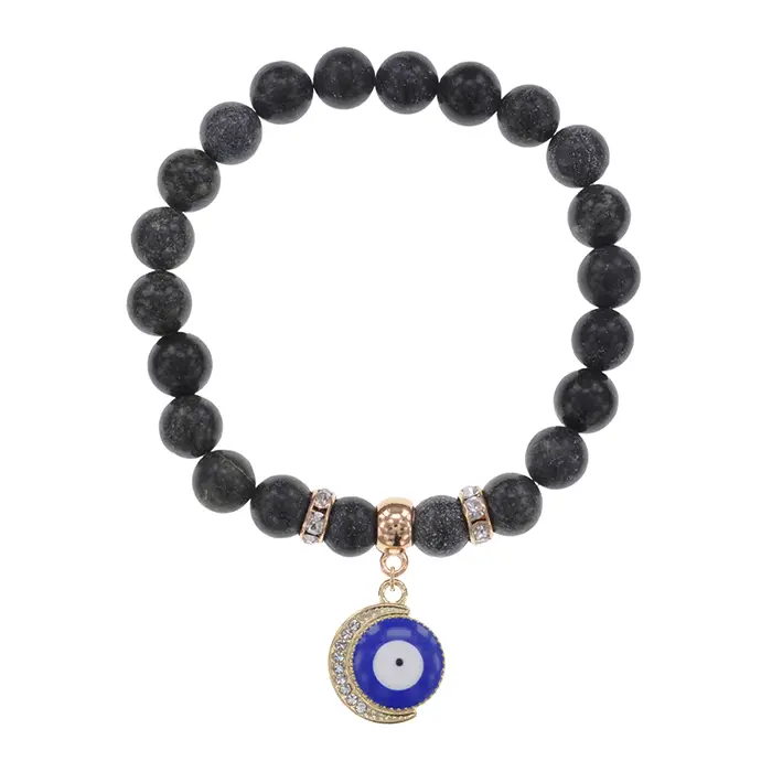 Стрейч-браслет для ношения, изготовленный из натурального камня змеевик, с подвесками в виде полумесяца и глаза.