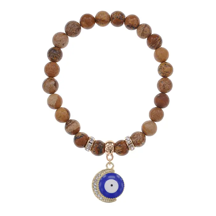 Стрейч-браслет из натуральной песочной яшмы с подвеской в виде полумесяца и глаза.