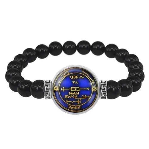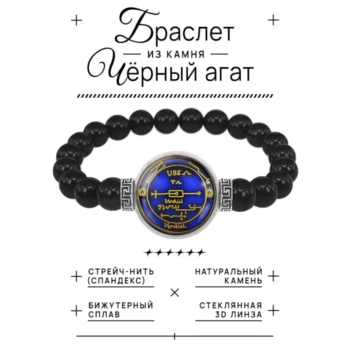 Стрейч-браслет амулет для судебных дел из бусин чёрного агата с изображением под выпуклой стеклянной линзой.