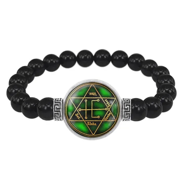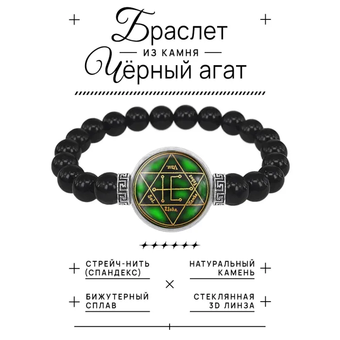 Стрейч-браслет-амулет из бусин чёрного агата с декоративным элементом под выпуклой стеклянной линзой.